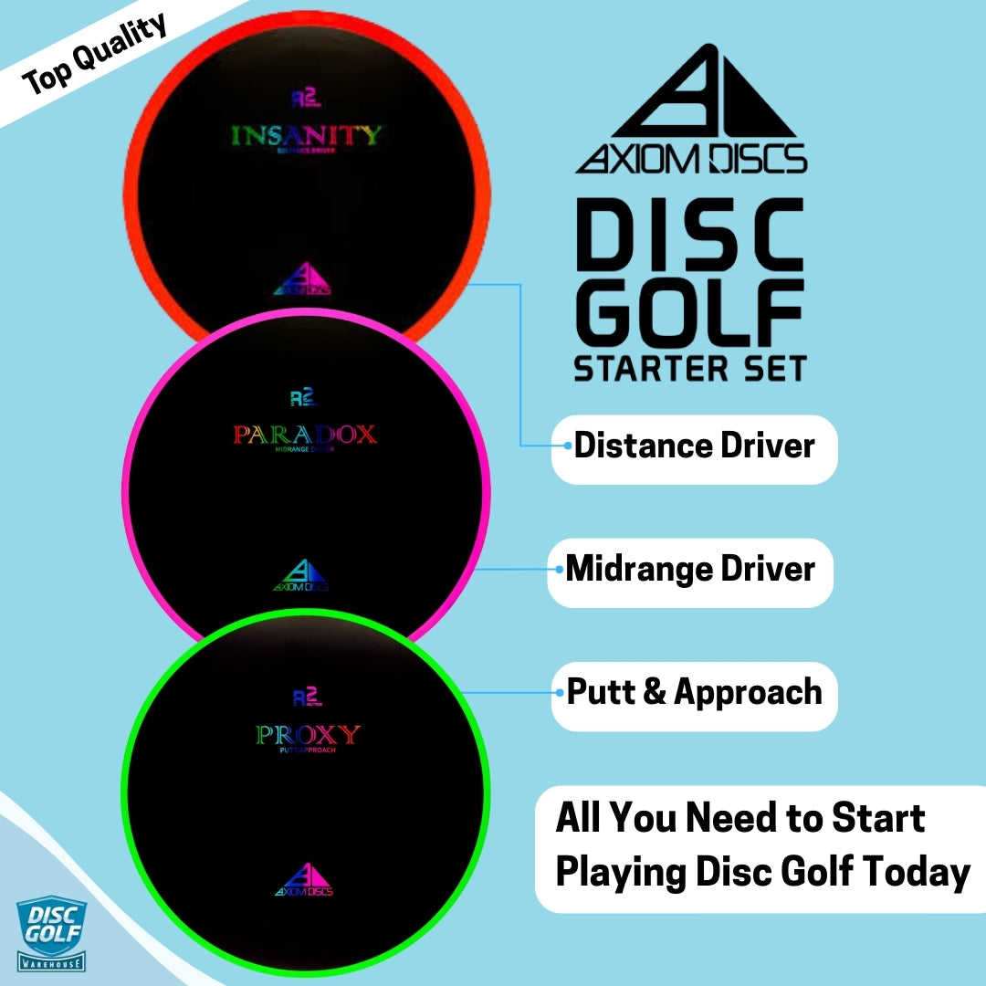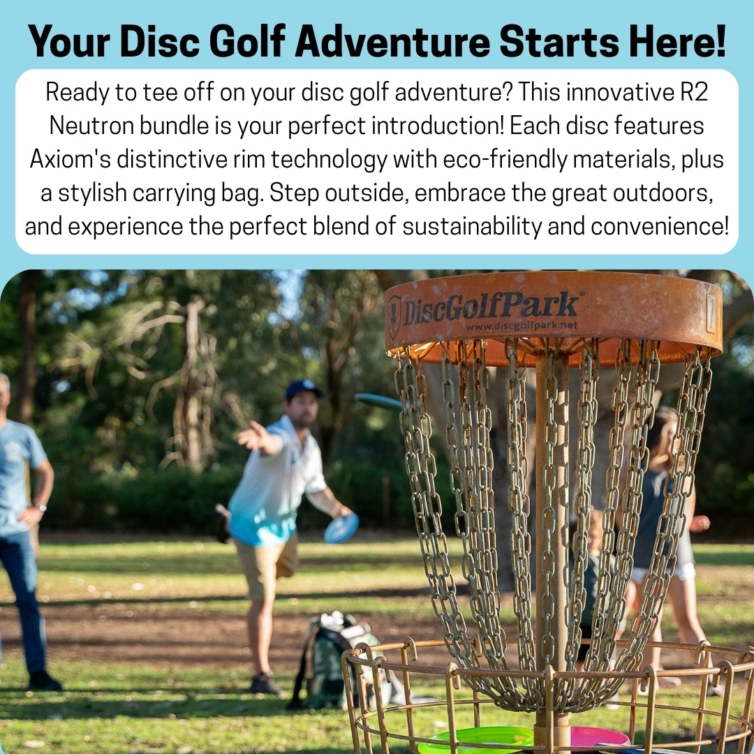 Ready to make a colorful entrance to the disc golf world? Our complete Axiom R2 Starter Package bundles everything you need to hit the course in style – the vibrant Axiom R2 Neutron Starter Set paired with our practical DGW Starter Bag!