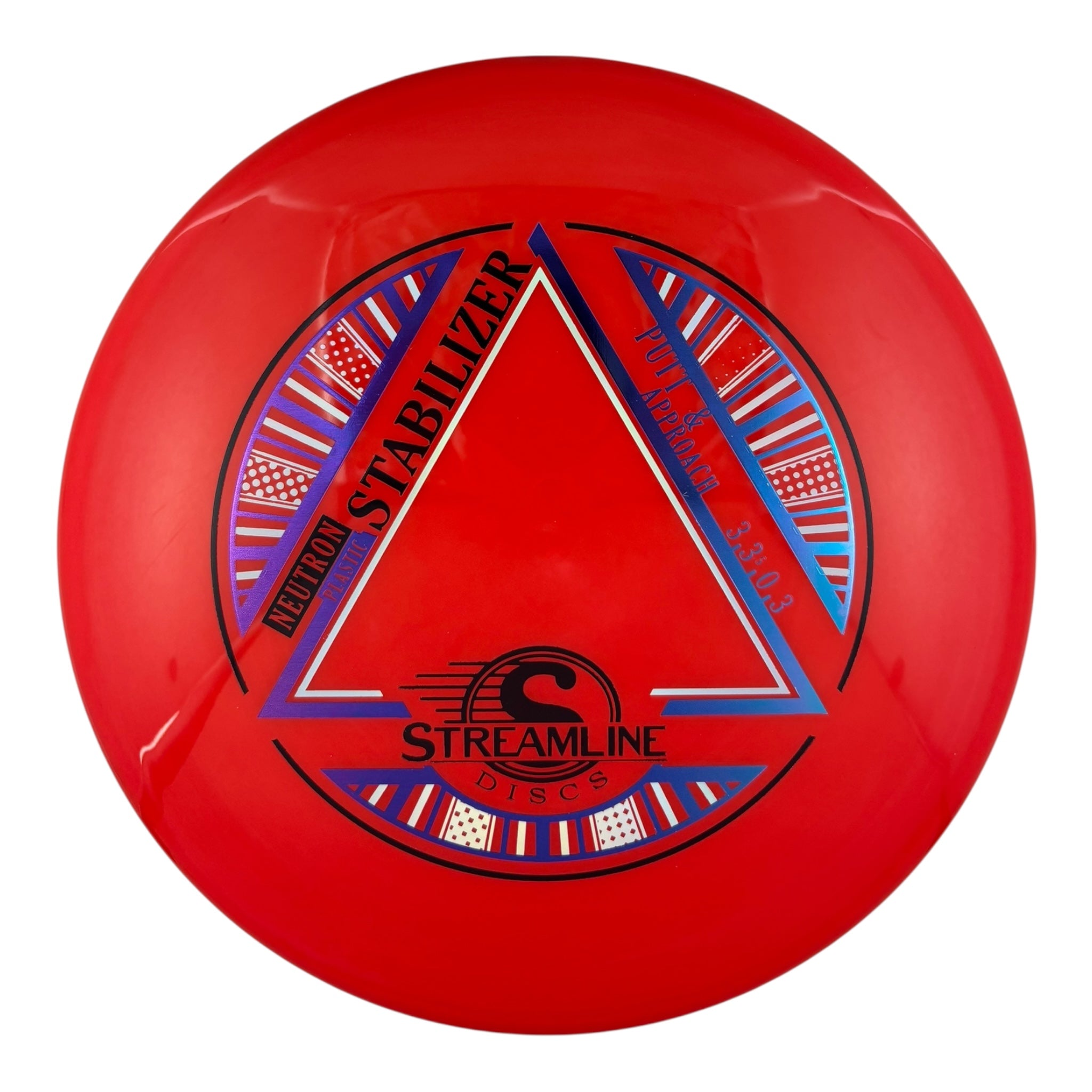 The Stabilizer is a new overstable putter from Streamline Discs, making its debut in Streamline Neutron and Cosmic Neutron plastic. This is the second putter from Streamline Discs and is the overstable compliment to the Streamline Pilot. The Stabilizer has a similar hand feel and depth as the Neutron Pilot, but with a slightly raised shoulder and more pointed nose that produces a flatter and more stable putter. The Stabilizers defining flight characteristic is straight flights with minimal turn, into a strong finishing fade for point and shoot accuracy on the approach.